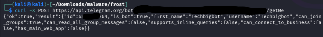 Slight aside, for those who are unaware of the curl command. It is an incredible tool. A powerful utility for testing endpoints. But if you favor graphic interfaces, there are things like Postman to help build queries as well. If you find yourself in a situation like this, choose your favorite or roll your own with some python! Back to the results. After reaching the /getMe endpoint using curl and got some favorable results!