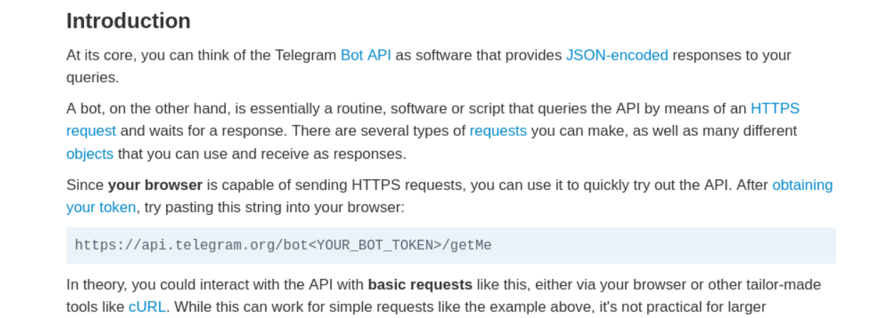 A bot in this case is simply some program designed to interface with some sort of application but then be capable of responding in the Telegram messenger directly. To see more information about what all a bot can do, there are documentation pages on the telegram webpage. As I was looking through what all could be performed I wanted to do some simple operations to verify I had everything I needed. In the API docs, there is a method called /getMe. It exists to be a very simple test verify things work.